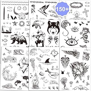 Qpout Tatouages Temporaires pour adultes hommes femmes enfants (150+pcs), noir Tribal Totem tatouage autocollants visage main bras tatouages Crâne de taureau tête Mamba serpent loup lapin croix hibou
