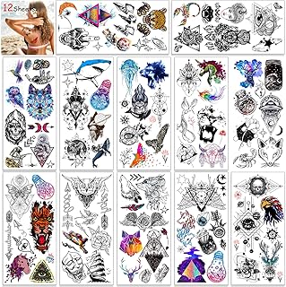 HOWAF 12 feuilles Tatouages Temporaires pour Femme, Homme, Enfant, Imperméable Tatouages Éphémères hibou oiseau Papillon Loup Crâne Faux Tatouage Autocollants pour Adultes